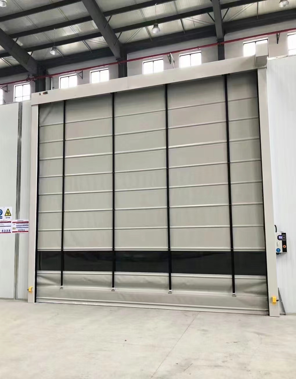 高強度PVC刀(dāo)刮塗層基布,門簾厚度0.8MM。體底座和中間部(bù)位均內置防風加強杆(gǎn)。抗風強度達到6-7級